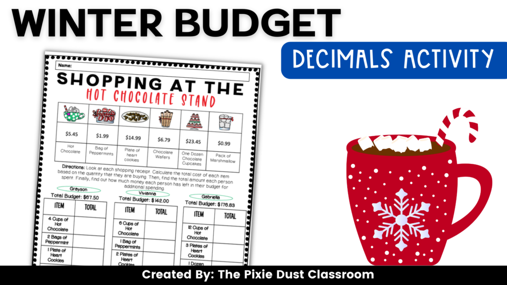 Using real-world connecting in math can be super helpful this time of year. Students are looking for excitement and engagement after coming back to school following winter break. While we can’t compete with the New Year celebrations, we can make things a bit more interesting in our math classes. Budgeting is a great way to practice decimal skills. Students often love thinking about money and spending, so why not make it a standards-aligned, winter-themed activity that will make an impact? In this activity, students create their own shopping list at the hot chocolate stand and calculate their total cost. Then, they study three budgets, adding decimals to find the total amount spent, subtracting decimals to find out how much money each person has left, and using that information to answer word problems while analyzing the information. This real-world connection math activity allows students to see why they are learning decimal skills and makes learning this standard much more exciting!